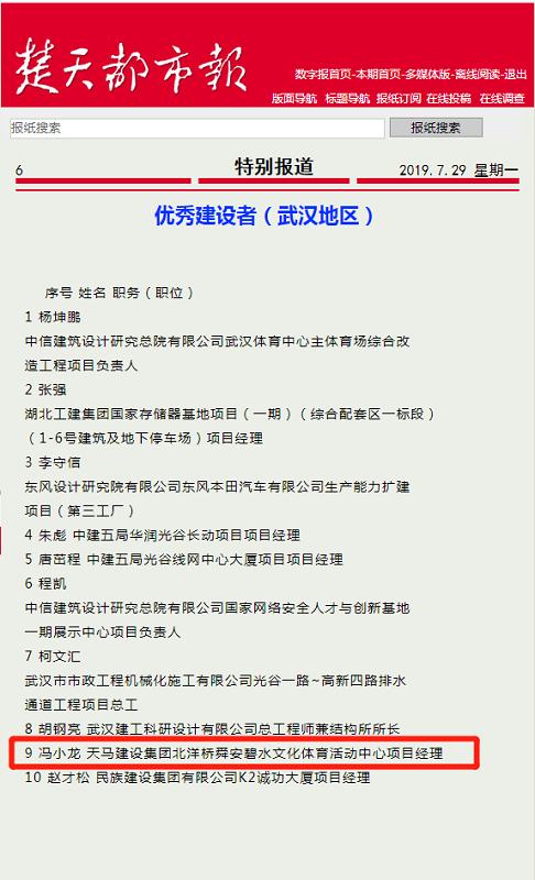 近日,由楚天都市報、武漢建筑業(yè)協(xié)會、武漢勘察設(shè)計協(xié)會、武漢市建筑行業(yè)工會聯(lián)合會聯(lián)合主辦,被譽為武漢城建行業(yè)“奧斯卡”的2019年武漢建筑及勘察設(shè)計行業(yè)勞動競賽“雙十佳”評選頒獎典禮,在楚天傳媒大廈隆重舉行。天馬建設(shè)集團北洋橋舜安碧水文化體育活動中心項目經(jīng)理馮小龍榮獲武漢建筑及勘察設(shè)計行業(yè)“優(yōu)秀建設(shè)者(武漢地區(qū))”榮譽稱號。